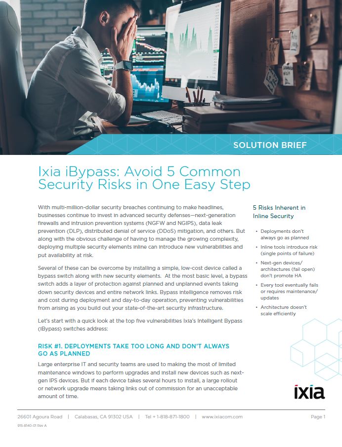 You can mitigate these and other challenges by including bypass switching intelligence as you migrate to next-gen solutions. Read the solution brief, “Ixia iBypass: Avoid 5 Common Security Risks in One Simple Step,” to learn how bypass switching works to: