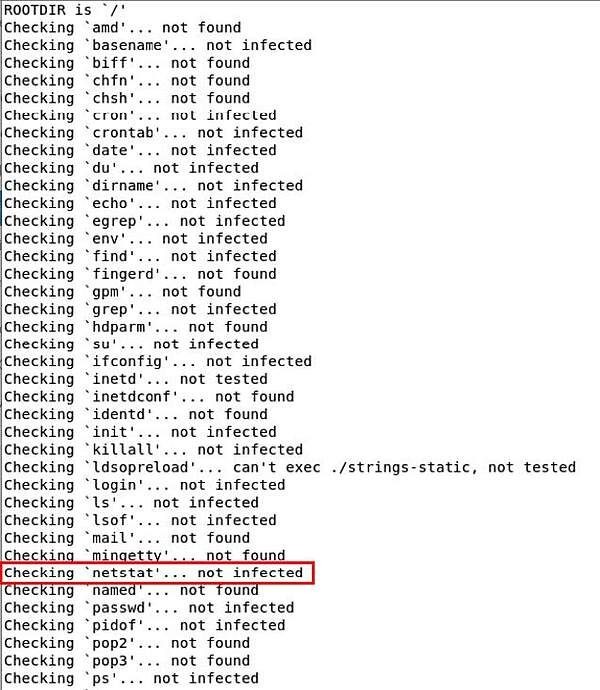 When I first began interrogating the host system, I uploaded two popular rootkit checking tools and ran them. The results from a portion of the rkhunter scan are shown in Figure 2 and a portion of the results from the chkrootkit scan are shown in Figure 3. Both these tools concluded that no rootkit was present.