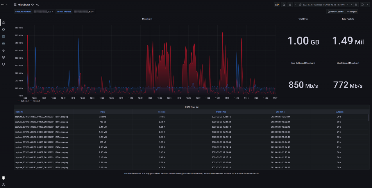 The microburst dashboard provides an overview of traffic microbursts measured on the IOTA interfaces. The dashboard automatically selects the two interfaces as inbound and outbound and displays the microburst data for each of them separately in a chart. This dashboard can be used to get a general overview of microburst events and intensity, and then drill down on the time range where a microburst higher than usual was detected.