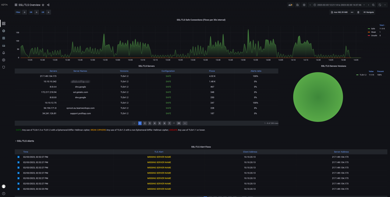 This dashboard provides an overview of TLS-encrypted connections and whether they are considered safe, weak, or unsafe, based on the TLS version and cipher used. Connection information can be sorted and filtered to visualize and identify potentially problematic connections.