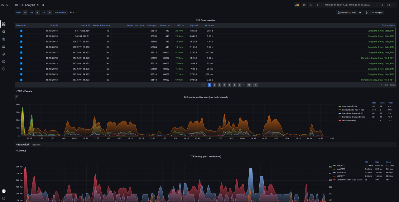 IOTA integrates its own powerful traffic analysis software, providing the ability to perform flow-based analysis of the PCAP files with various dashboards, like Application Performance Monitoring, Bandwidth Usage, Latency, Top Talkers, TCP Troubleshooting, and more.