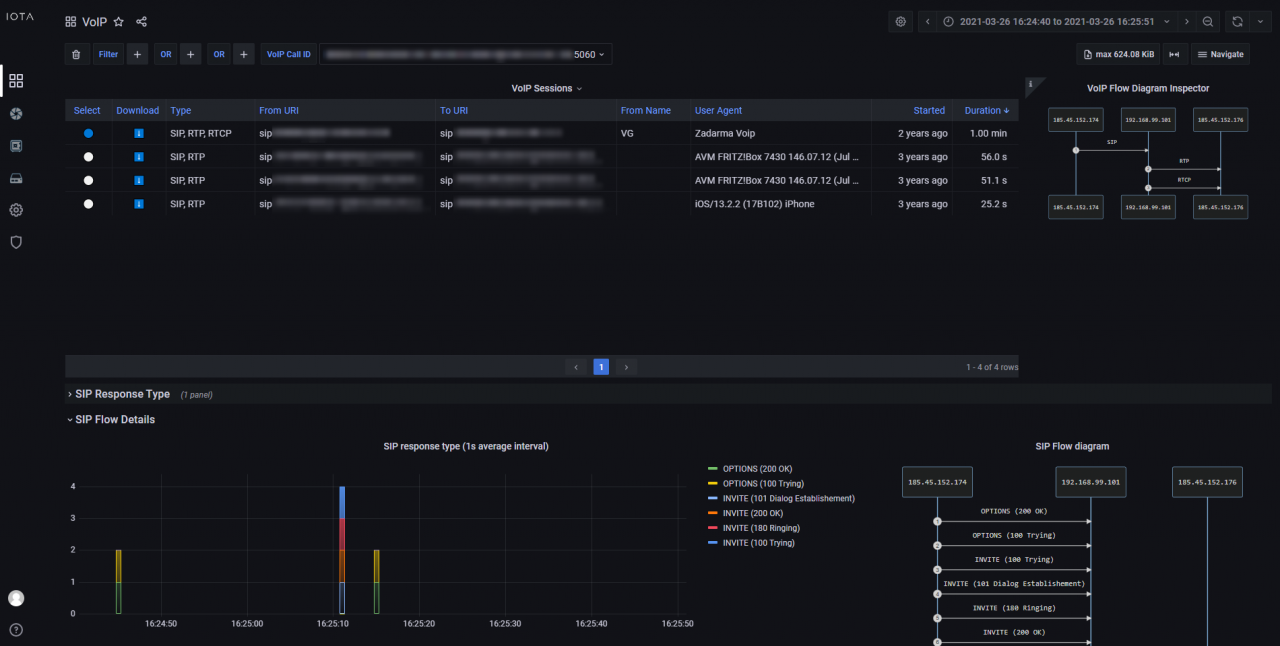 The VoIP dashboard provides an overview of recorded VoIP sessions, with the possibility to dig down on SIP and RTP metrics and details.