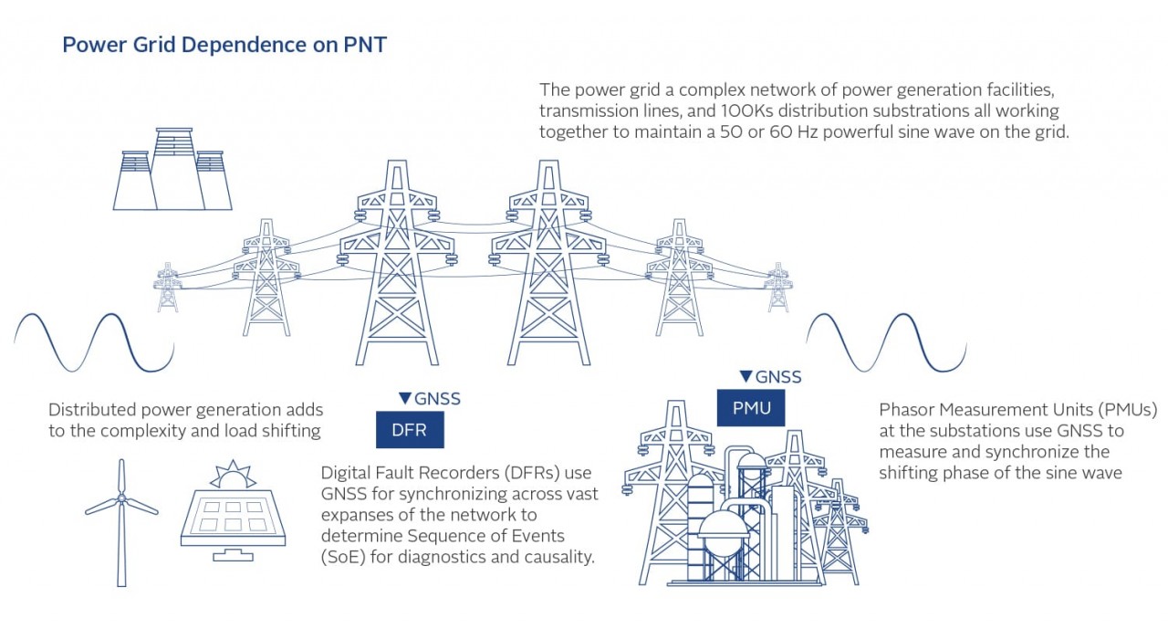 - The Power Grid depends on precise time synchronization, as shown in Figure 3. Keeping the 60 Hz AC power in phase across the grid is a challenge. The main device supporting this process is the PMU – Phase Measurement Unit. It monitors the sine wave against a reference time, usually GPS, and provides feedback to the systems controlling phase alignment. One degree of phase error in this 60 Hz sine wave is 46 microseconds, so accuracies of tens of microseconds in measurement are desired, though ~100s microsecond errors can be tolerated. The other class of devices requiring sync are the Digital Fault Recorder (DFR) and Sequence of Event Recorders (SER). To diagnose faults and determine causal relationships, you must have a common time reference to know what happened first, what happened next, etc. Just like many other sectors, the power grid only needs relative time, not absolute UTC time, but when operating over wide distances, UTC or GPS time is the easiest way to access a common clock. Two trends are occurring in the power industry that will influence its evolving need for resilient PNT: