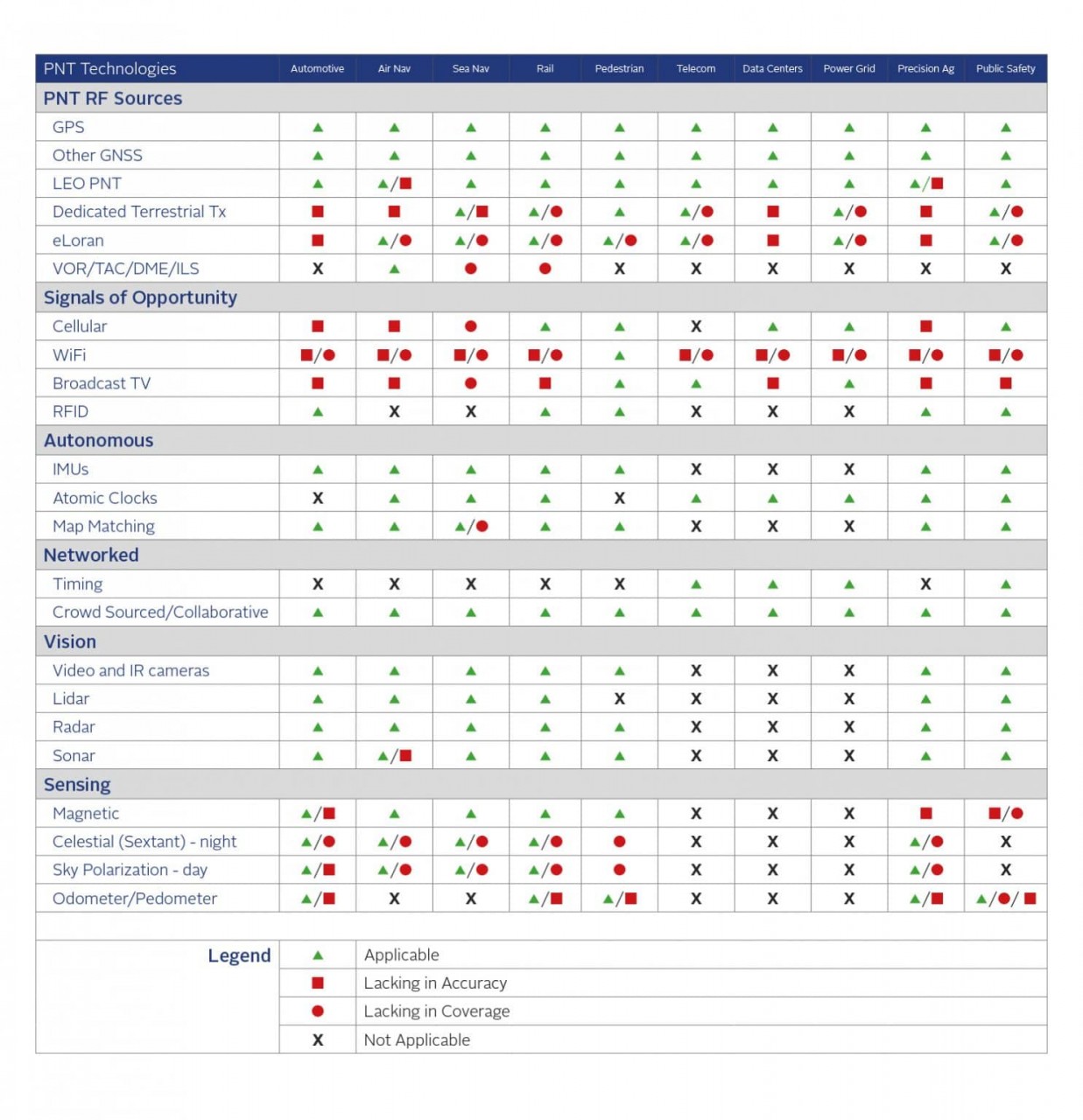 In Figure 1, we identify the many PNT technology sources available, and in Table 1 we show the applicability of each source to the critical infrastructure sectors.