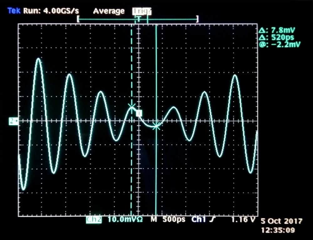 Note: Due to a limitation with the oscilloscope used here, the 1 PPS signal is not drawn. However, the 50% rising edge is aligned with the vertical dashed line on the figure. The plain line is synchronized with the phase inversion of the RF signal. In this example, we measure a fixed offset of 520 +/- 100 ps between 1 PPS and RF signals.